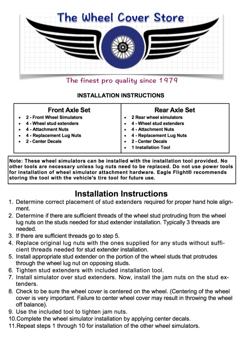We include our trademark high-quality resin bubble center emblems as shown that dress up the appearance when installed and are your assurance that you have purchased Genuine Eagle Flight covers.