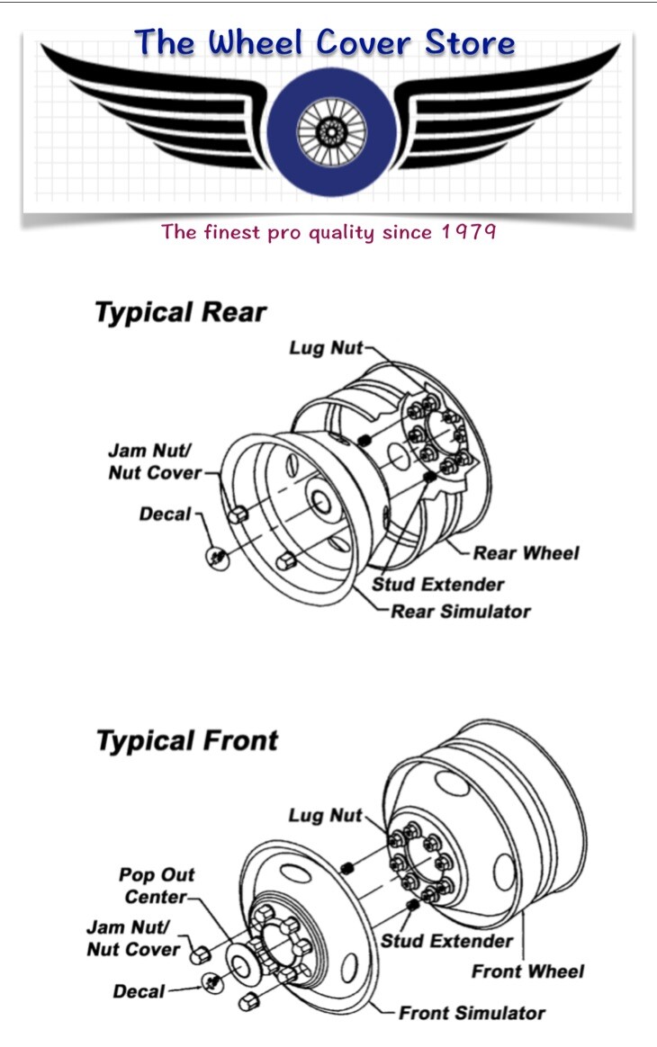 Easy installation: after two lug nuts per wheel have been removed and replaced with our lug nuts, install two stud extenders, slide the covers over the extenders, and lock with two jam nuts. The mounting hardware kit includes a jam nut installation tool.
