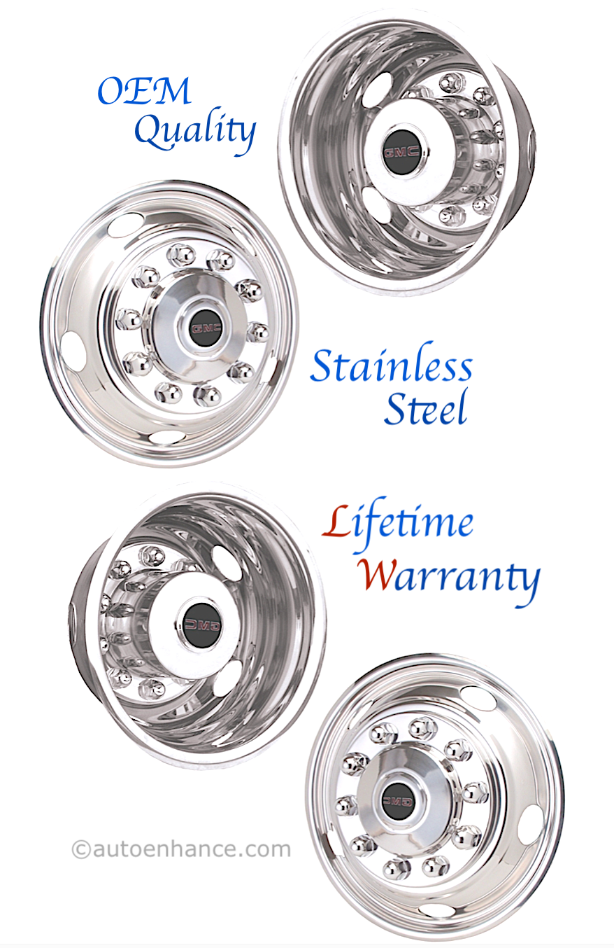 These GMC Licensed O.E.M. Quality rim covers fit GMC trucks with 22.5″ 10 Lug 5 Vent Hole Hub-Piloted steel wheels that have an 11.25″ bolt circle and one of the noted stamped wheel numbers.
